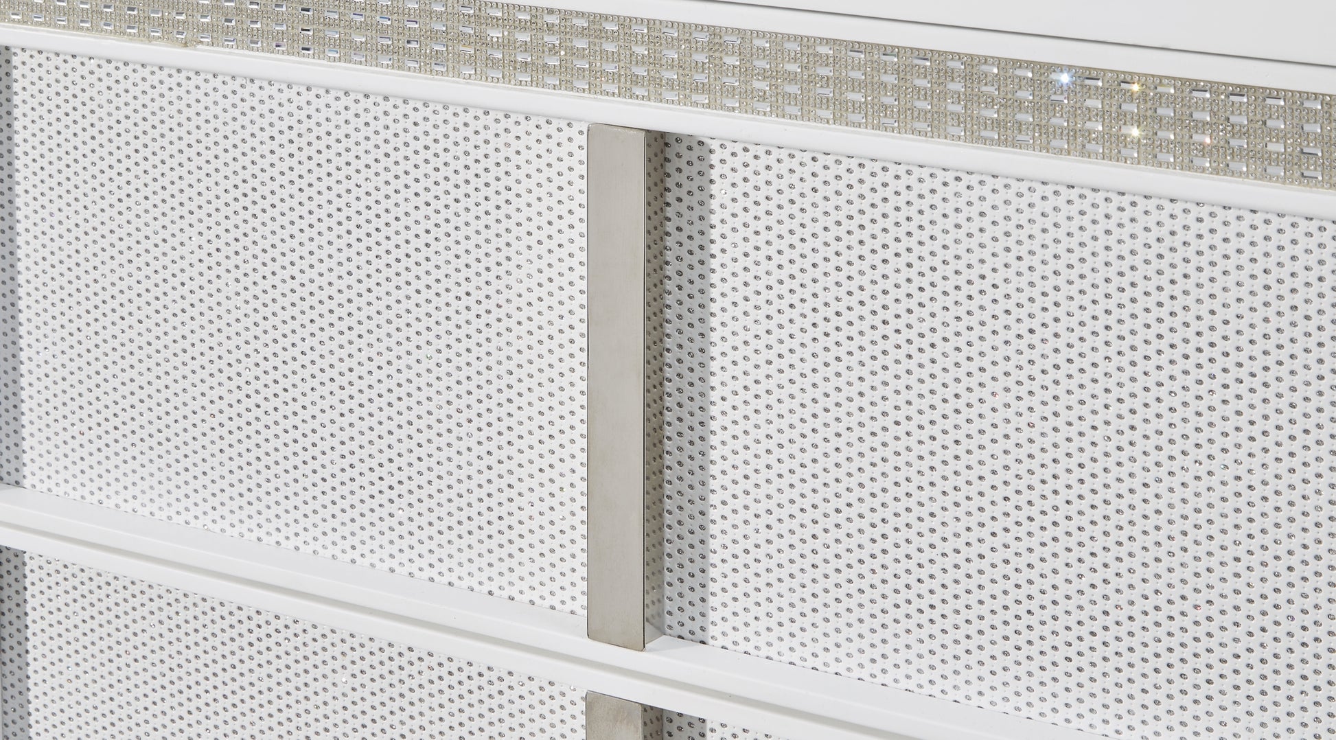 | Details | Includes dresser and mirror, Made with solid wood components, MDF substrate and decorative laminate, White lacquer finish, Vertical metal drawer pulls, Built-in LED lighting with 3-way dimmer switch, 6 drawers with fully finished interior, dovetail construction and heavy duty ball-bearing side glides, Drawers with rhinestone frames; textured laminate drawer fronts, Mirror attaches to back of dresser, Power cord included; UL Listed | |