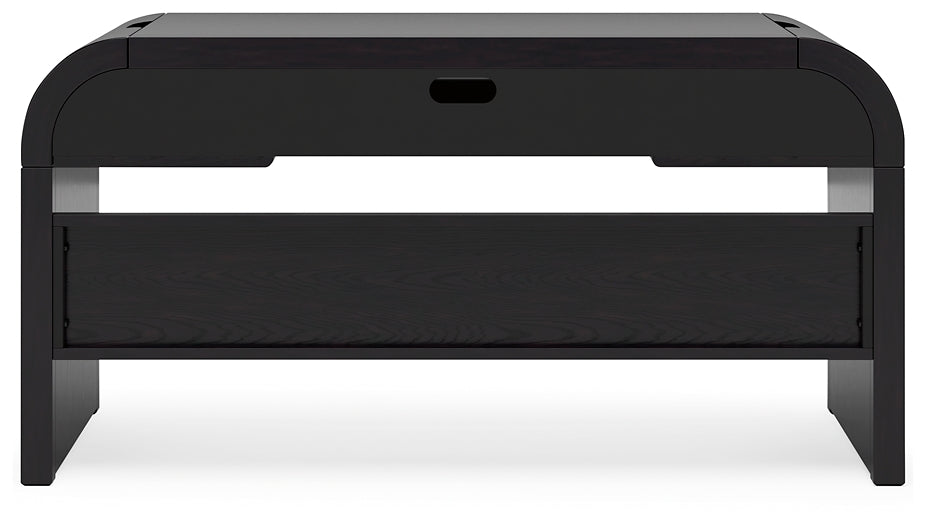 Inspired by art deco design, this softly shaped home office desk makes a lasting impression in a simply stunning way. Its magnificent curved silhouette is enhanced by a rich layered black finish on the textured wood grain surface. Complete with ample storage, a pull-out keyboard tray and USB charging, this is the all-in-one piece you’ve been looking for to elevate your contemporary workspace decor.