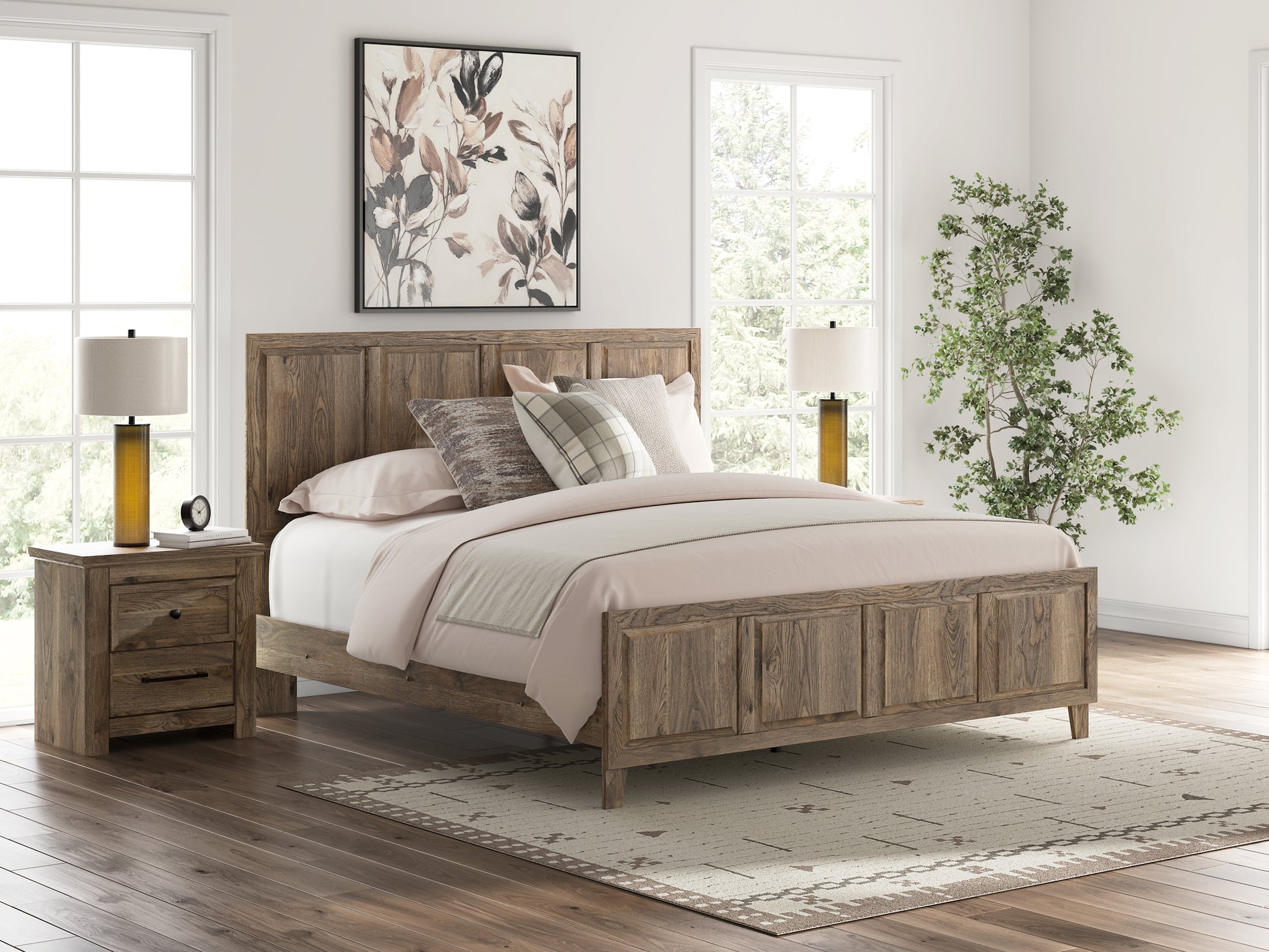 Rusticott Queen Panel Bed with Mirrored Dresser and Nightstand